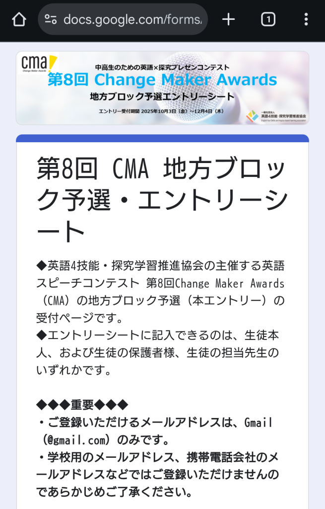 ※学年、および英語スキルは審査の対象にはなりません。今後のCMA運営のための参考資料として使用させていただきます。