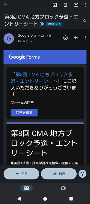 4.メールを開くと、エントリーシートに記入した内容を確認できます。また、「回答を編集」のボタンを押すと、エントリーした内容を修正・変更することができます。